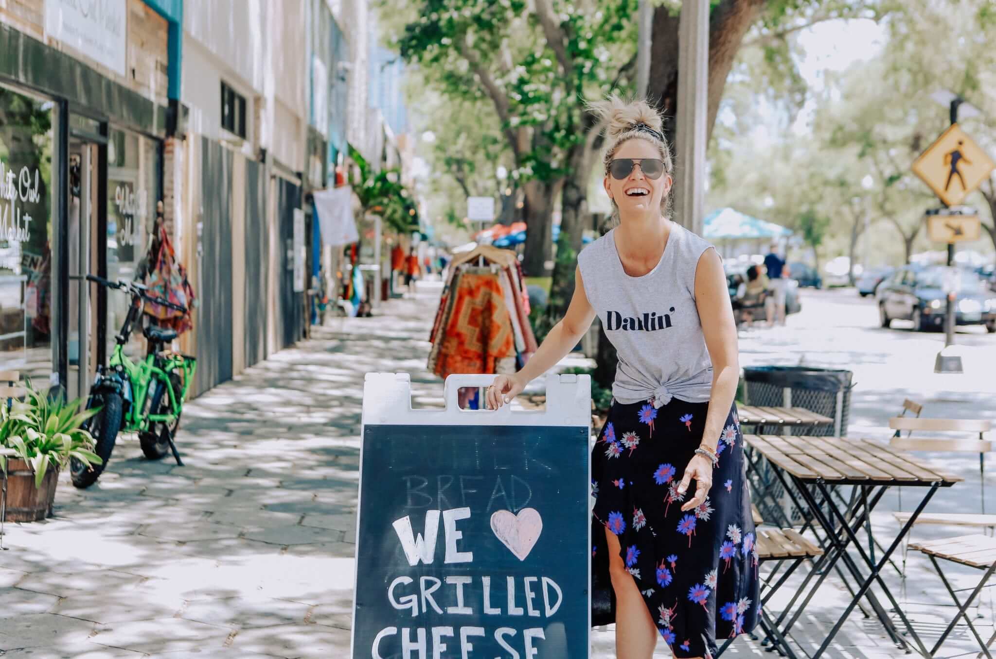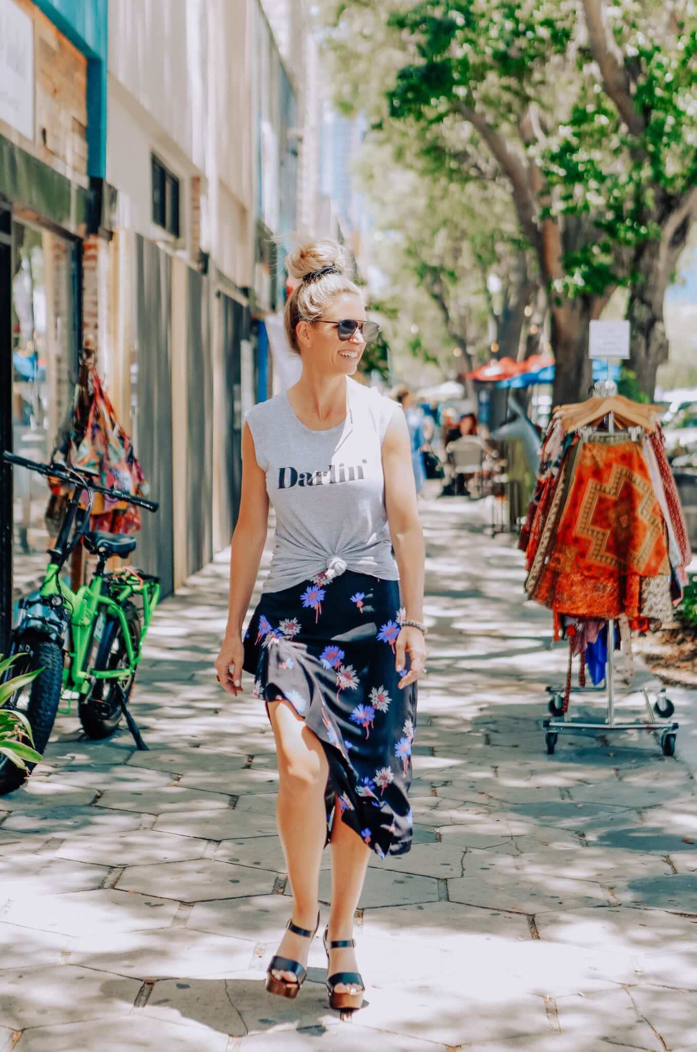 REBECCKA MINKOFF DARLIN’ TEE | TANYA TAYLOR FLIRTY FLORAL SKIRT (SIMILAR) | LE SPECS PRINCE AVIATORS | GORJANA BRACELETS