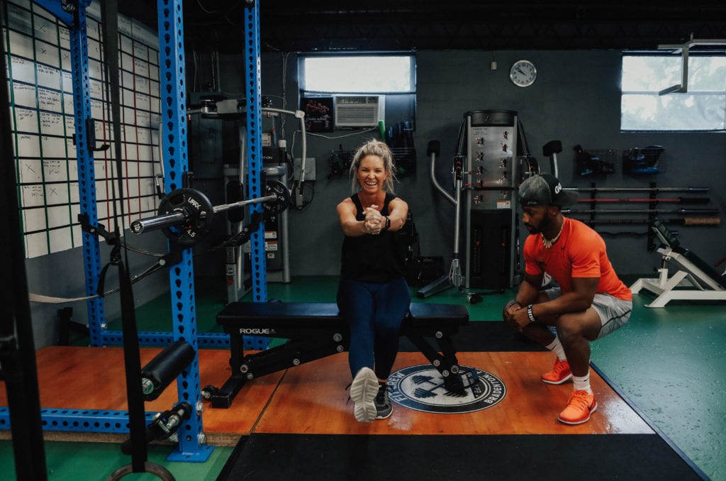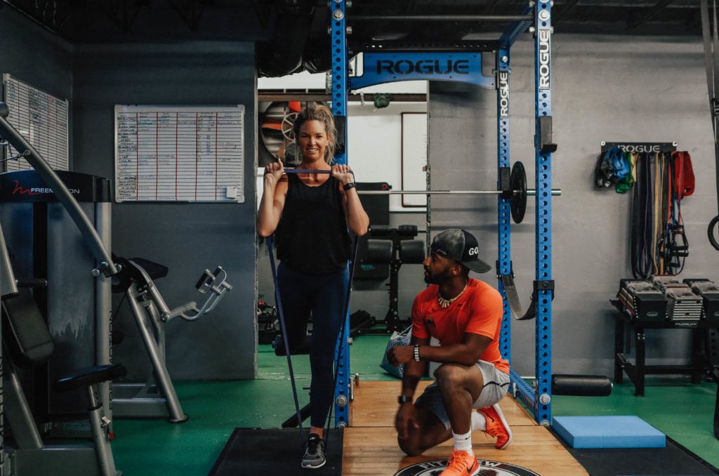The banded single leg squat increases lower-body strength, particularly in the quads and glutes, increases core strength, and improves balance.